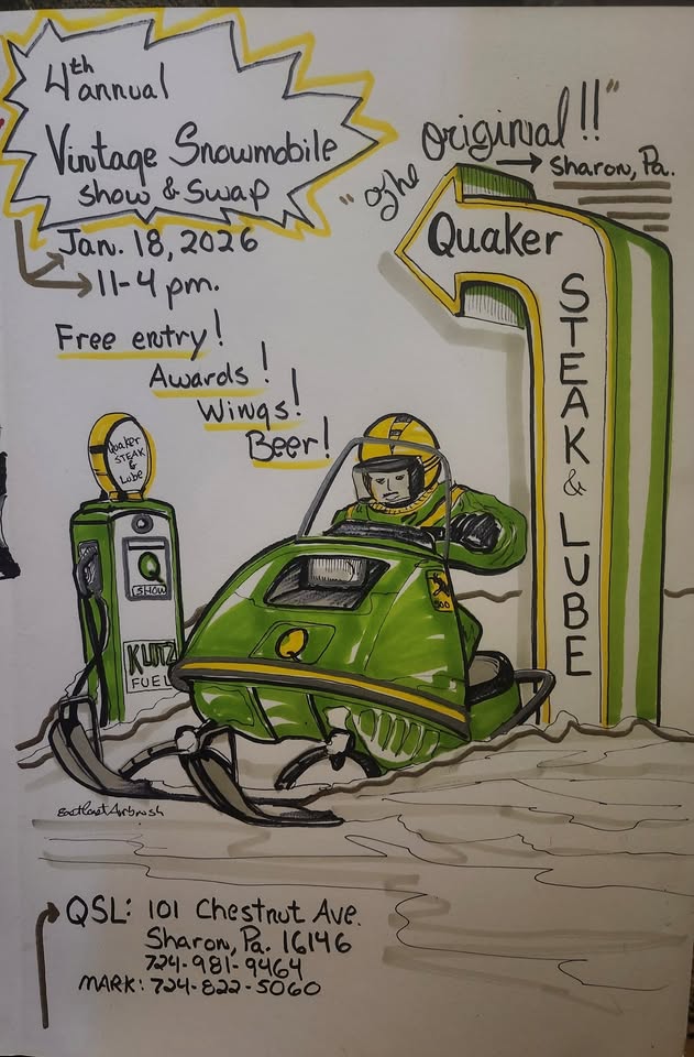 The Vintage Snowmobile Show & Swap is back for its fourth year at the Original Quaker Steak & Lube in Downtown Sharon! Head to The Lube on Sunday, January 18, 2026 from 11 AM to 4 PM for an afternoon of winter fun! Open to any make and model of snowmachine, show off your sled for a chance to win show prizes and awards. The event is free and open to the public. For more information, contact Mark at 724.822.5060 or The Lube at 724.981.9464