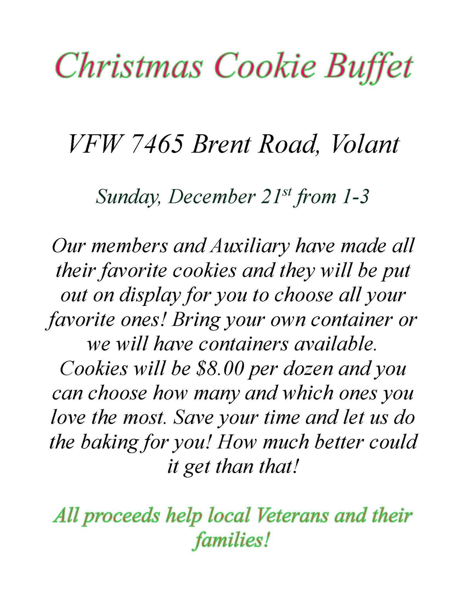 21dec1:00 pm3:00 pmAnnual Cookie Saleat the VFW Post #7465