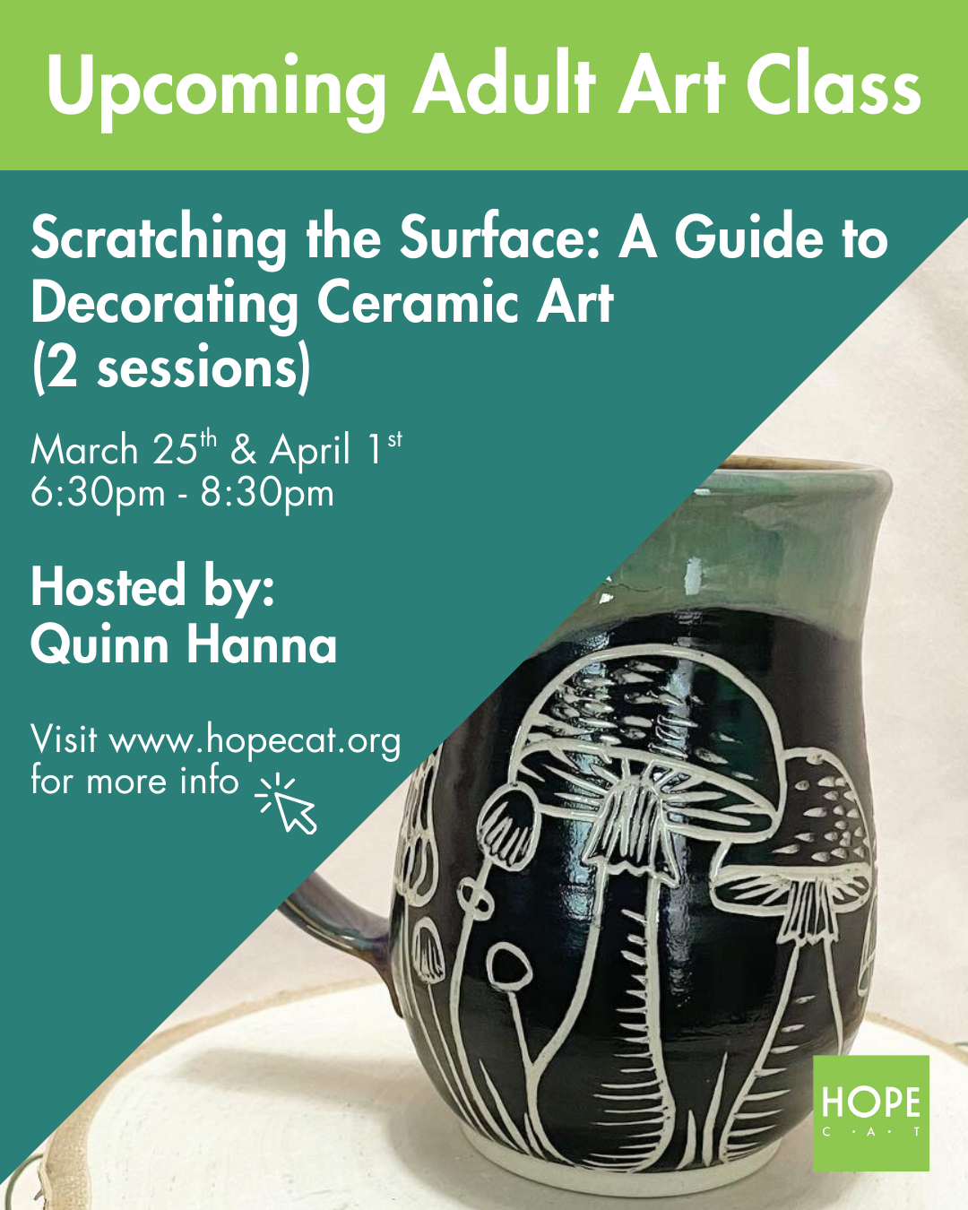 In this two-session workshop, students will explore creative surface decoration techniques for ceramic artwork. Over two 2-hour classes, participants will work with both commercial and unconventional materials. The first session focuses on decorating wet clay through sgraffito using slips and underglazes, applying silkscreens directly onto clay, and properly using underglaze transfers while altering imagery through collage. In the second session, students will work with bisque-fired pieces to experiment with glazing and inlaying stains, learning thoughtful approaches to color, texture, and surface design.