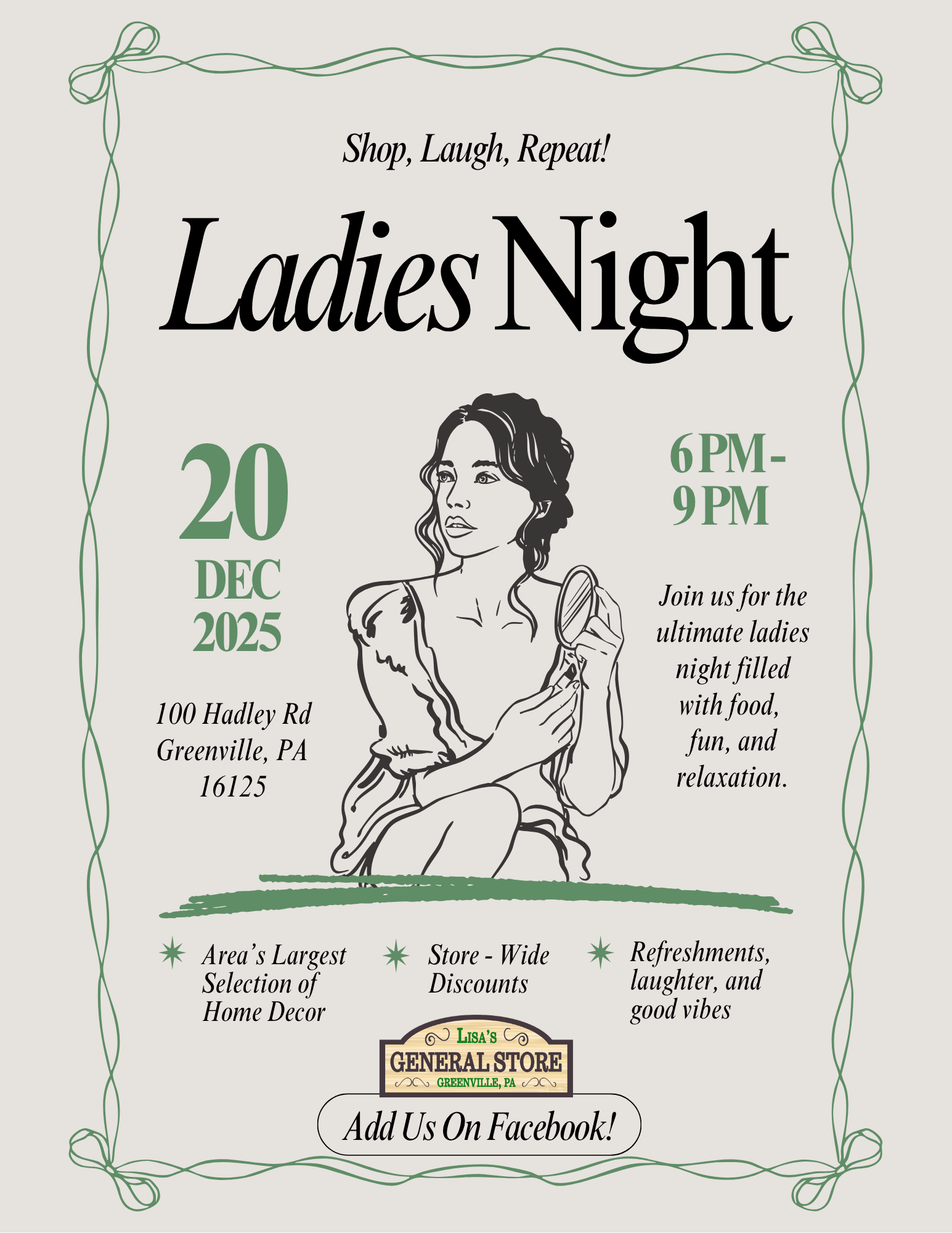 20dec6:00 pm9:00 pmLadies Nightat Lisa's General Store