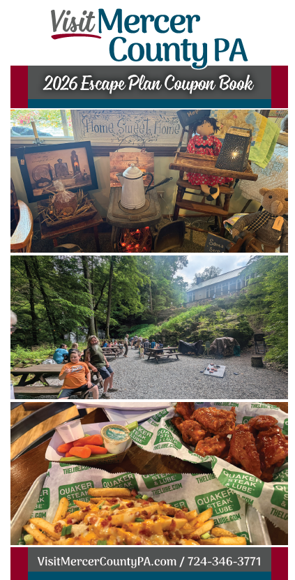 The 2026 Mercer County, PA Escape Plan Coupon Book has 78 offers from our members, including accommodations, camping, dining, breweries, wineries, attractions, shopping, services, and golf. We hope these coupons will provide added value to your stay in Mercer County, PA! Please fill out this form, and one of our planning experts will send you the 2026 Mercer County, PA Escape Plan Coupon Book, or call us at 724-910-2269 with any questions.
