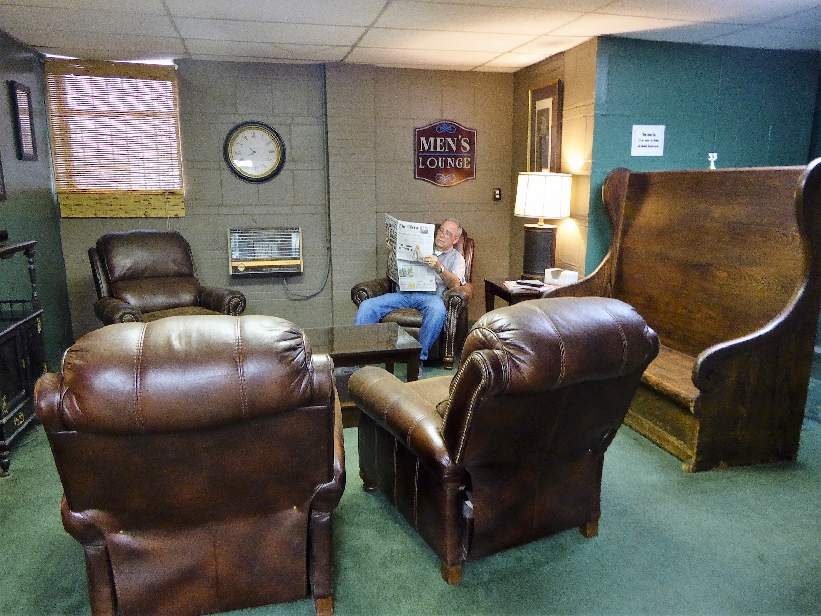 A men’s waiting room, complete with television and newspapers so women can get their shop on unimpeded. |